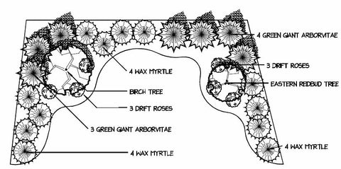 In the Design above, we have wax myrtle trees in groups of 4. They are spaced out at 6-8 Feet apart on center. At first they may look too spaced out but they grow fast. We decided to use Green Giant Arborvitae Trees to also help with screening. We placed the Green Giant Trees in the corners because this is where we needed the most privacy to block out the taller houses behind the fence. They grow tall and will eventually hide the houses.
